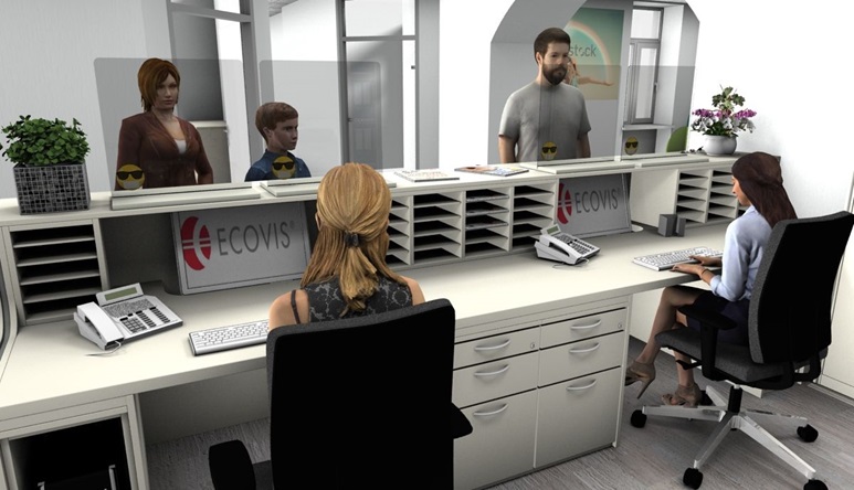 mit versenkten, und von Patienten Seite nicht einsehbaren Monitor Nischen. Auf der Theke mit Hust- Niesschutz.(Hust- und Niesschutz ist auch nachrüstbar und Einzel erhältlich. )