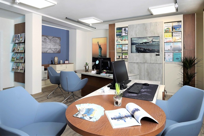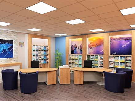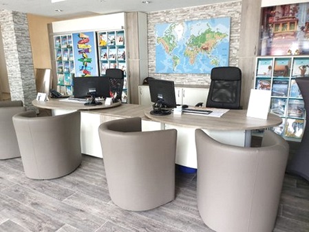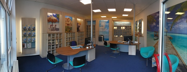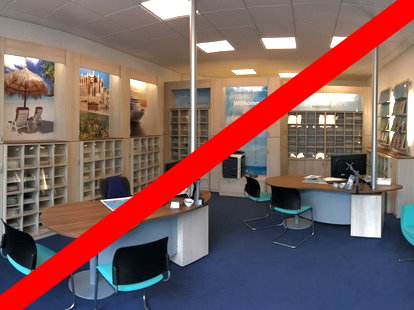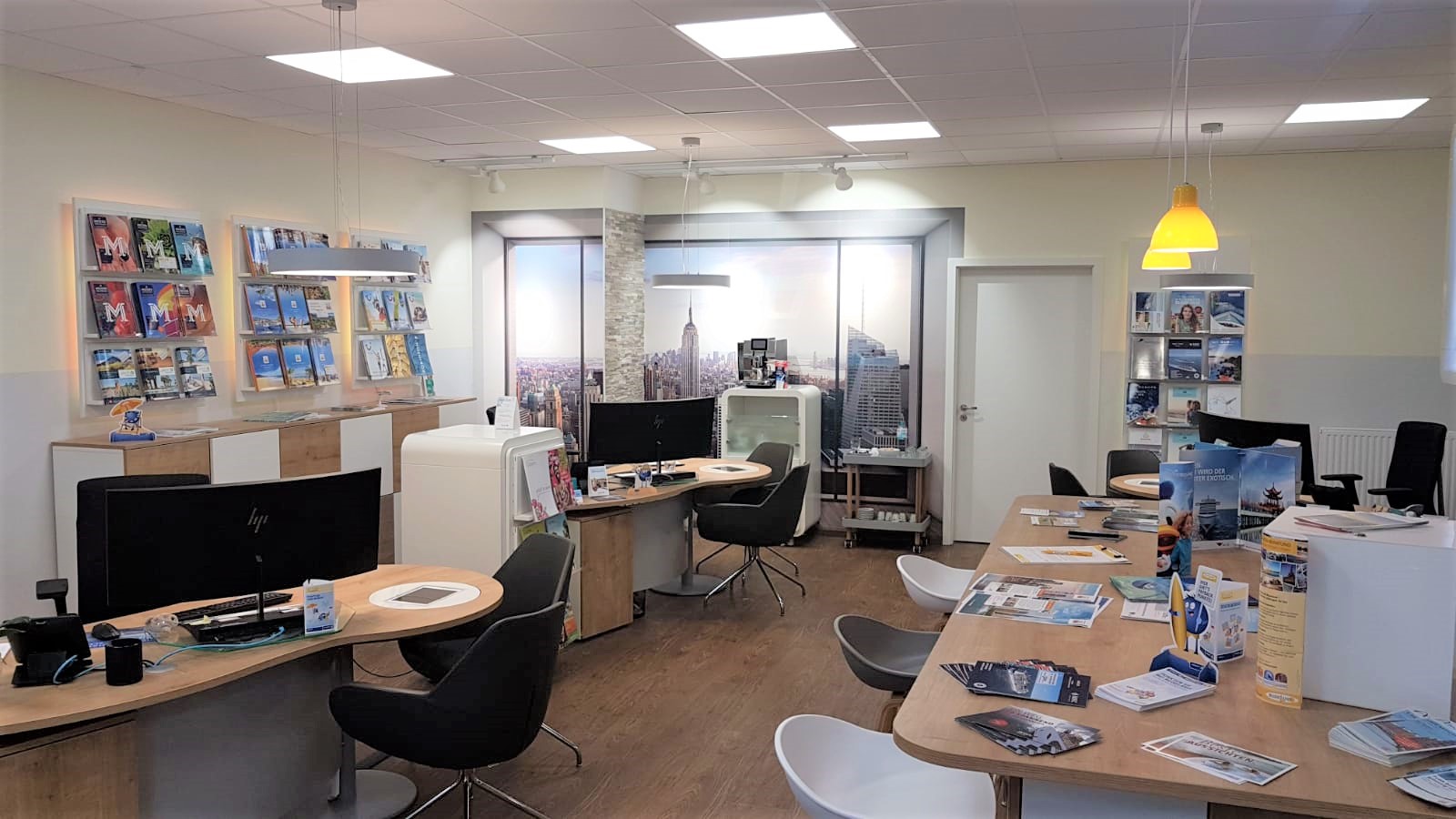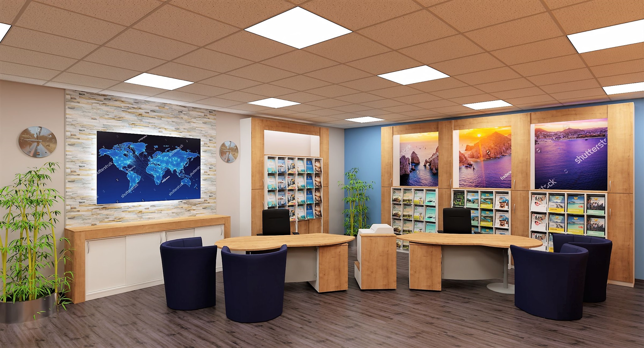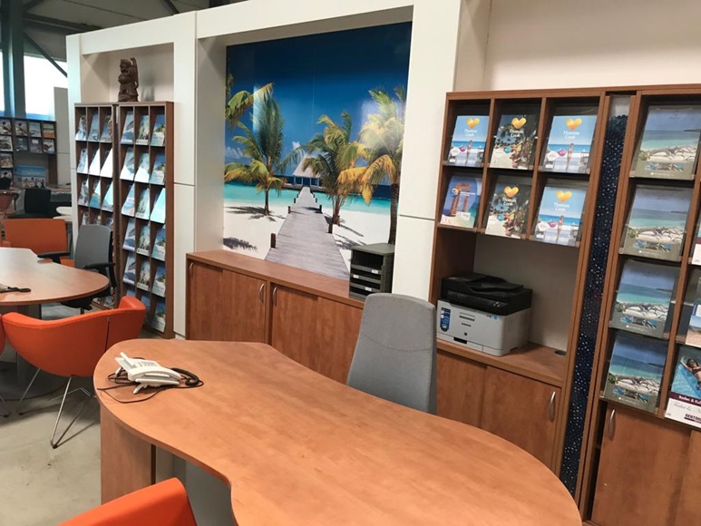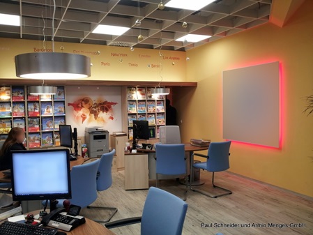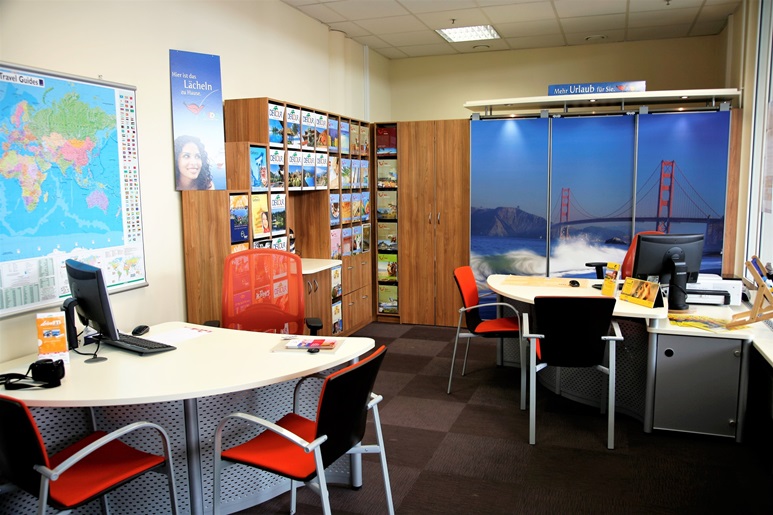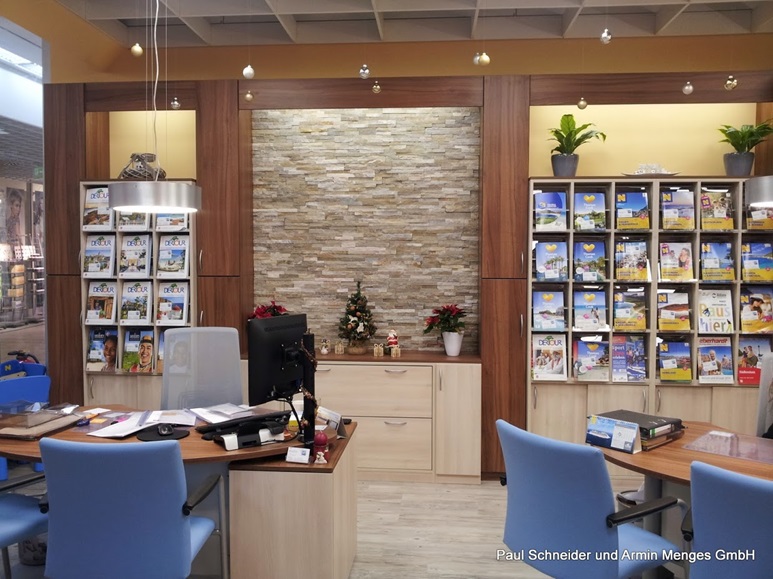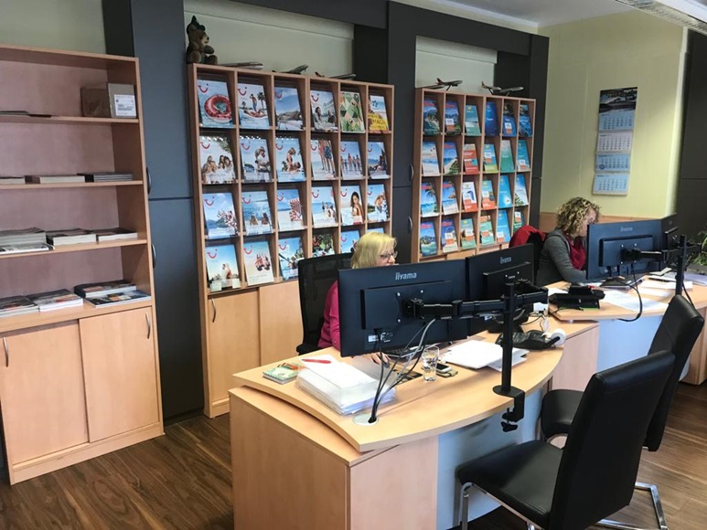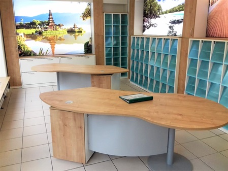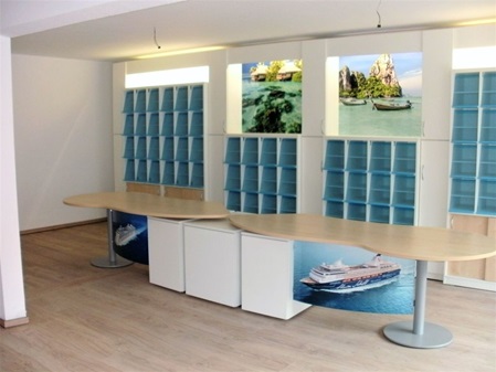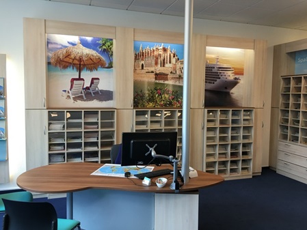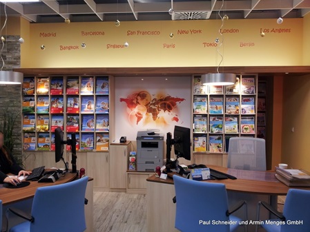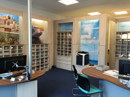Zeitlos schöne Reisebüro Einrichtung mit drei Arbeitsplätzen.