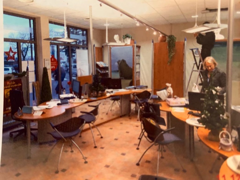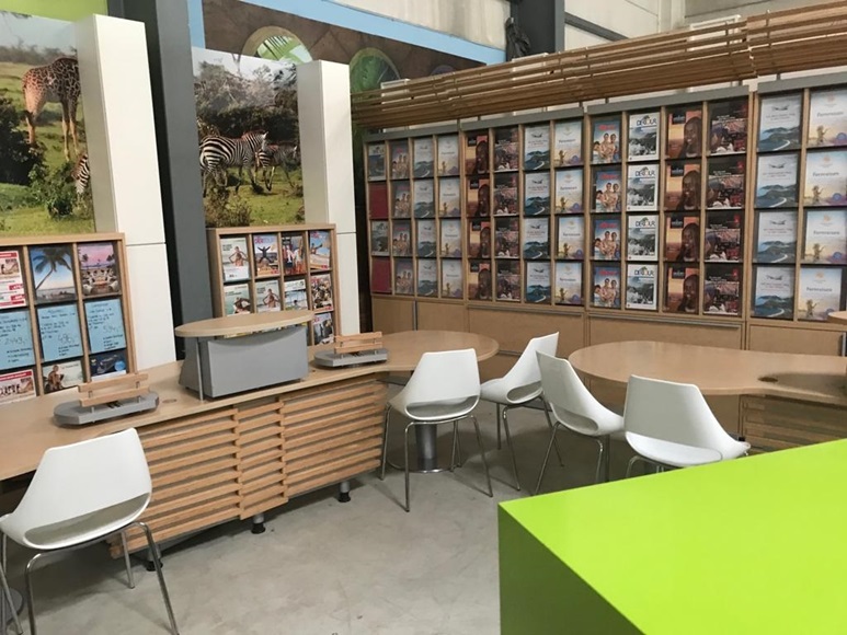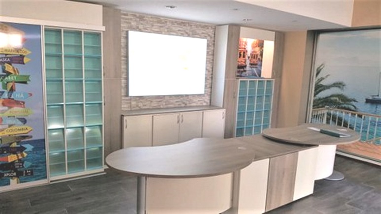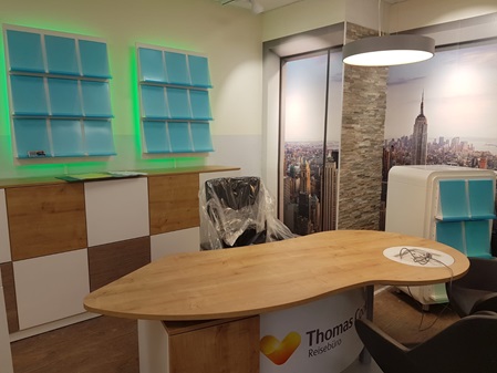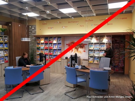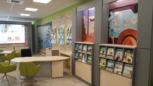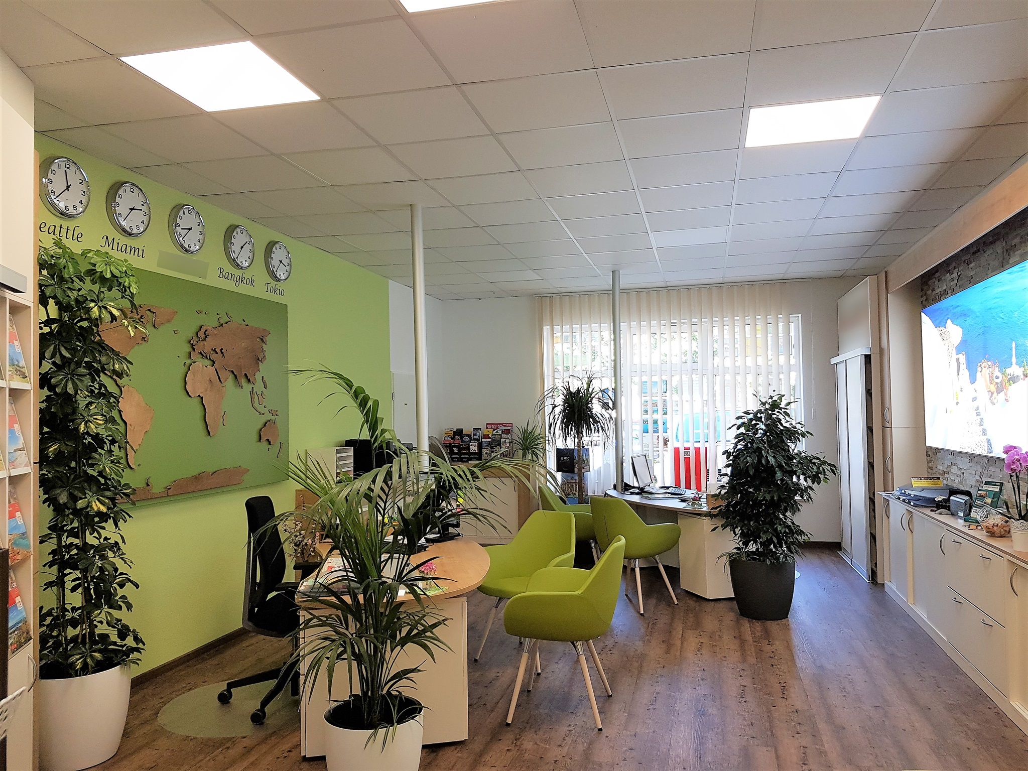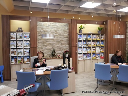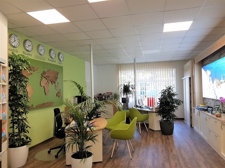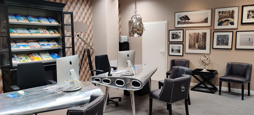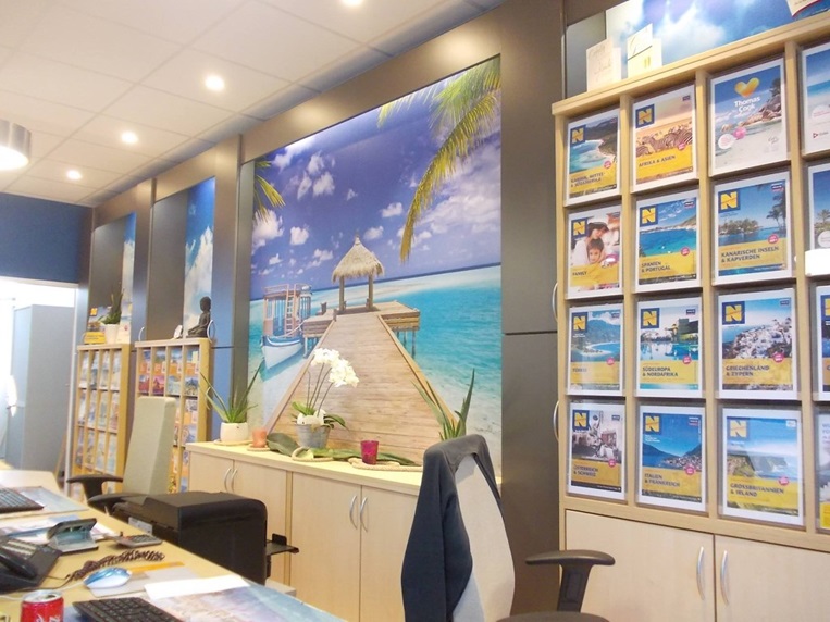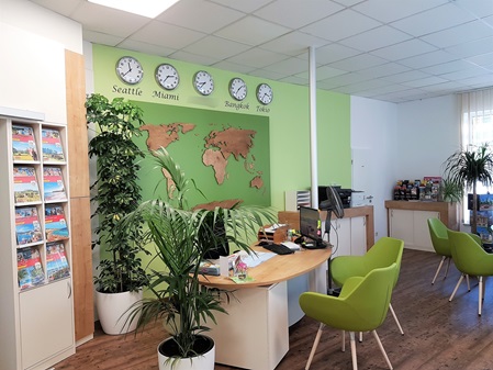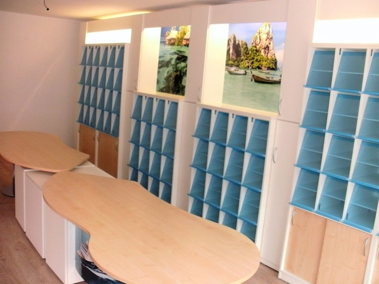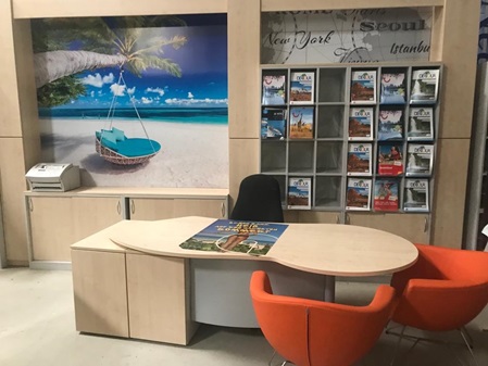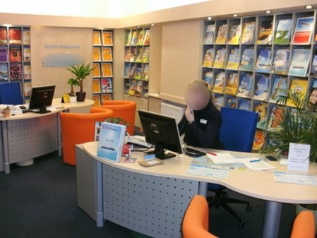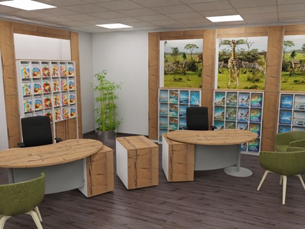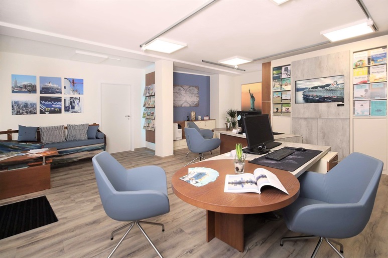 Zeitlos schöne Reisebüro Einrichtung mit drei Arbeitsplätzen.