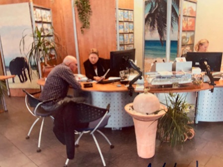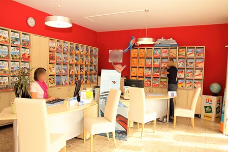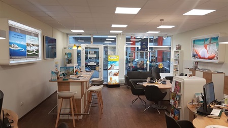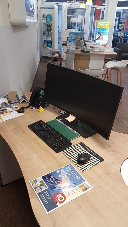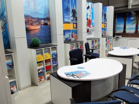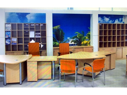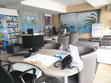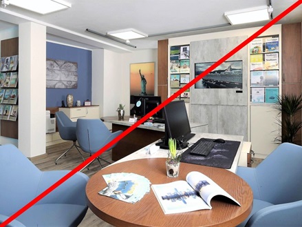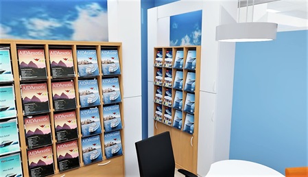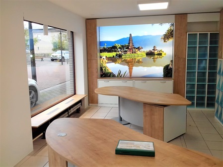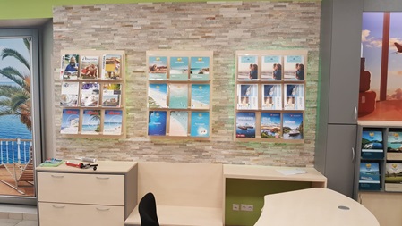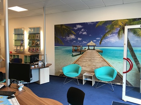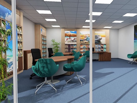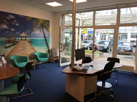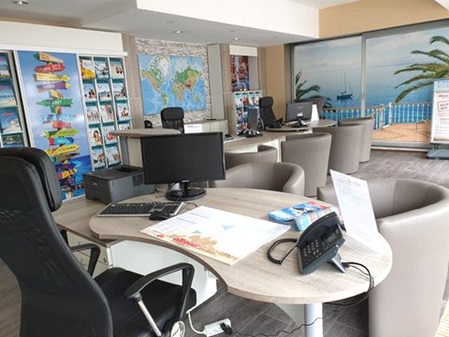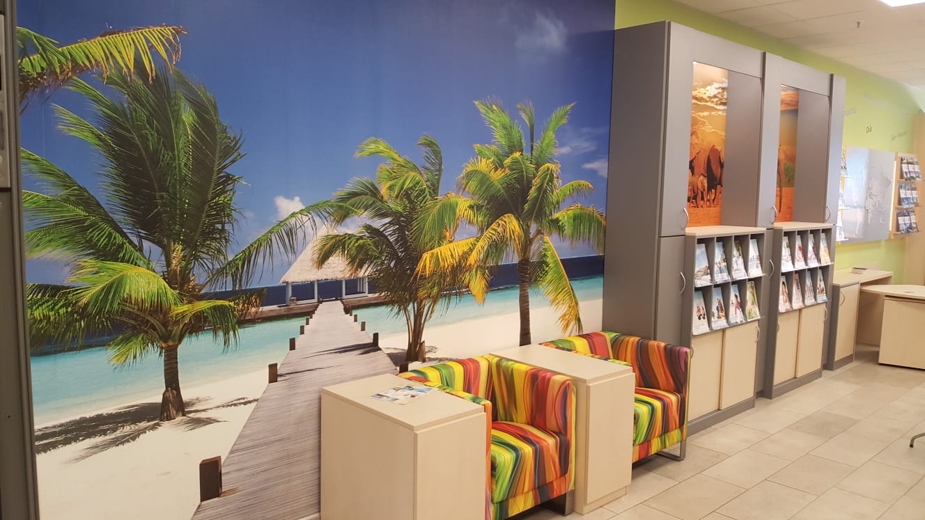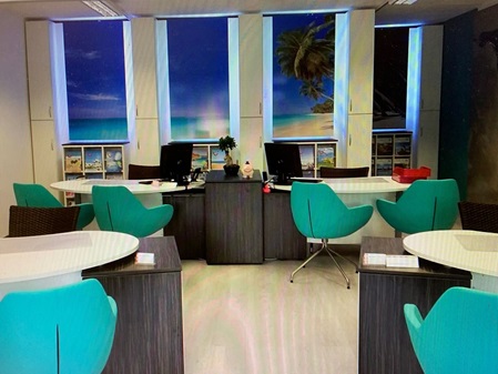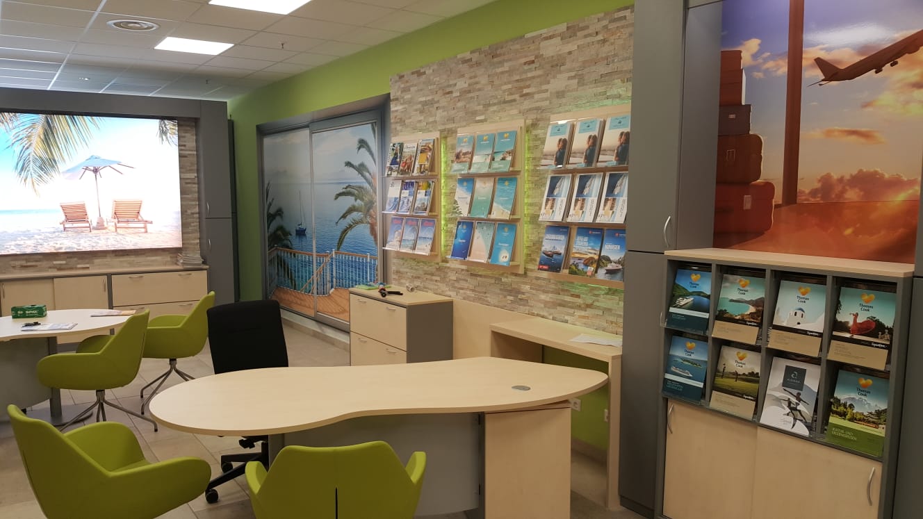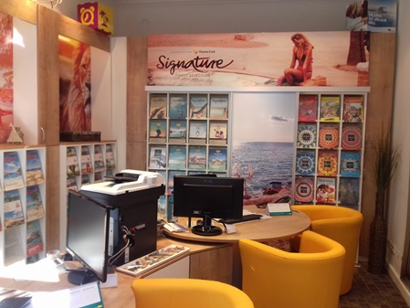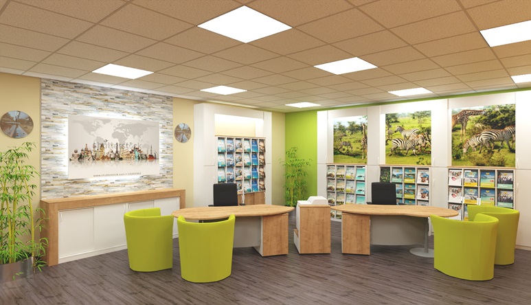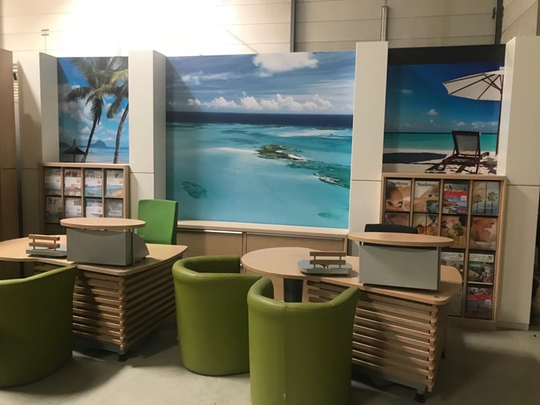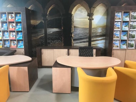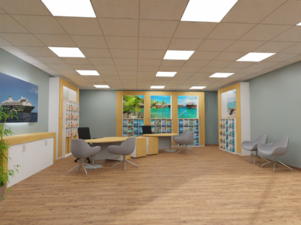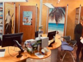 Zeitlos schöne Reisebüro Einrichtung mit drei Arbeitsplätzen.