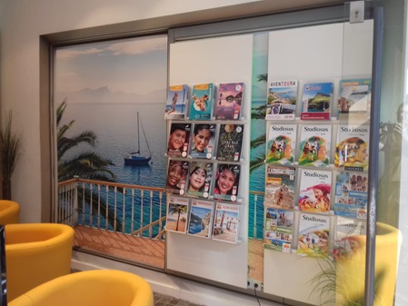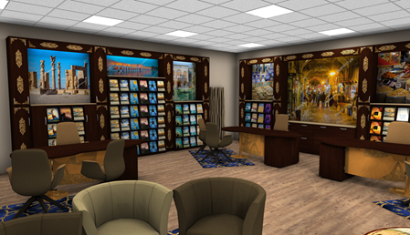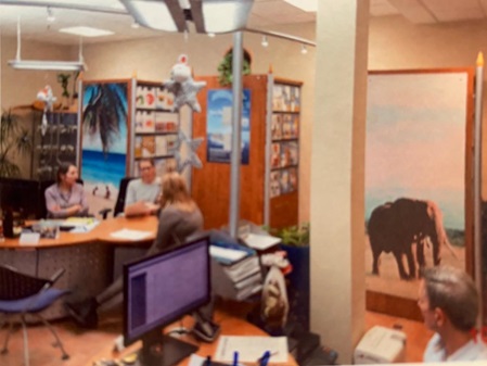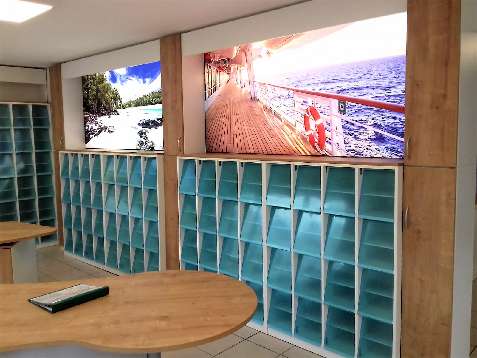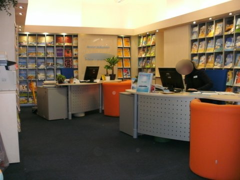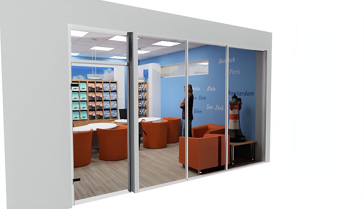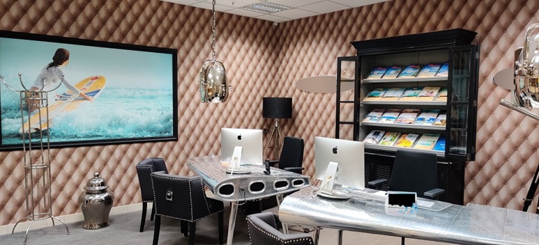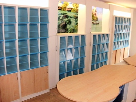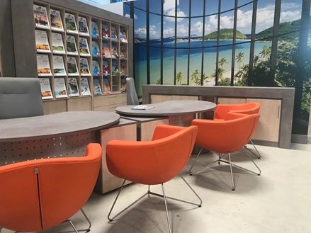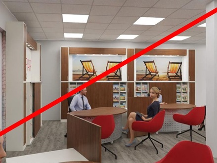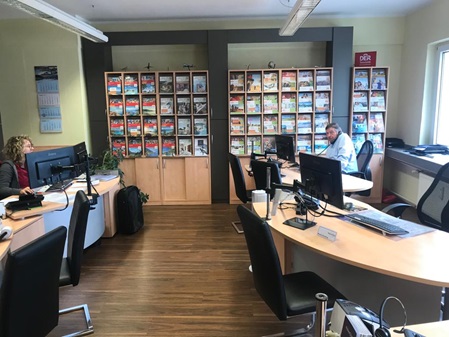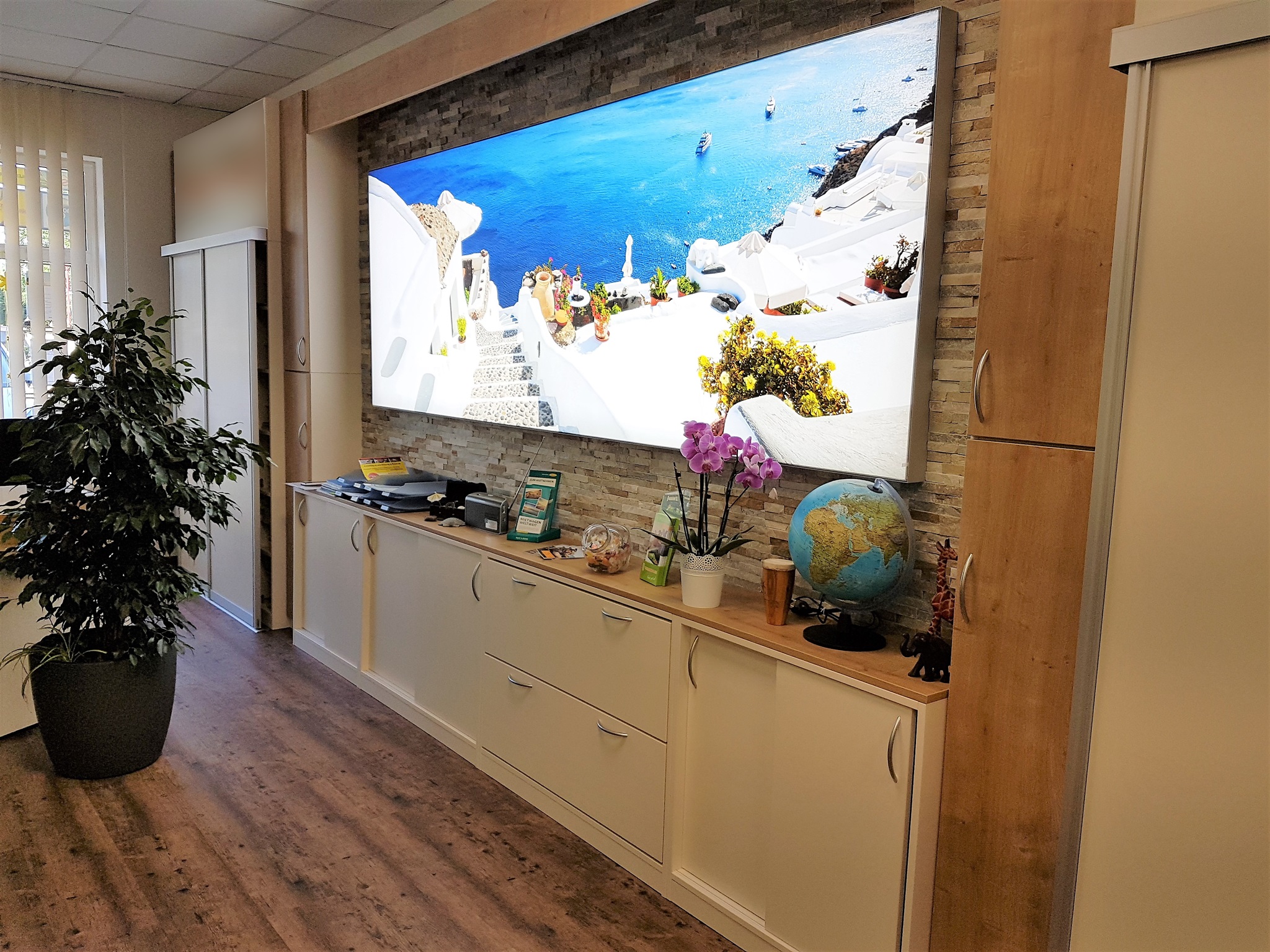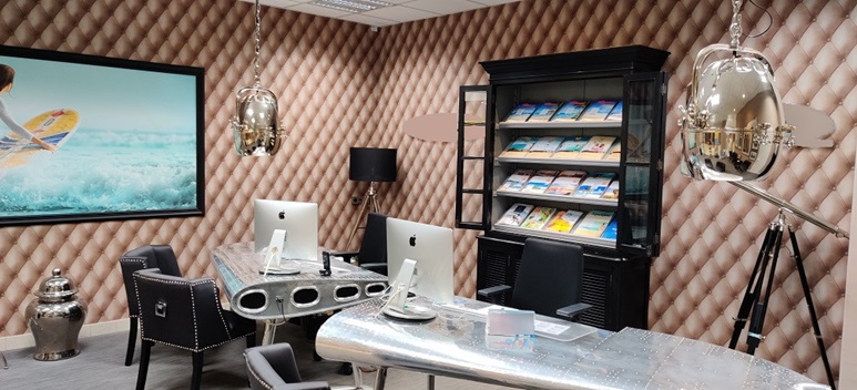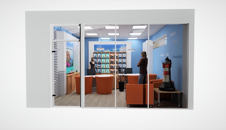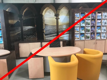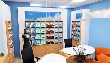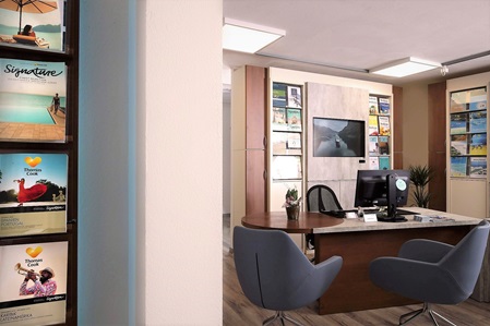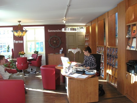 Zeitlos schöne Reisebüro Einrichtung mit drei Arbeitsplätzen.