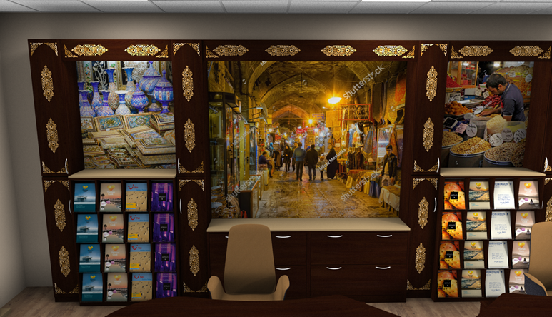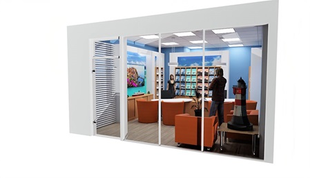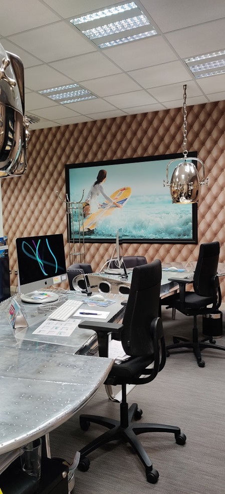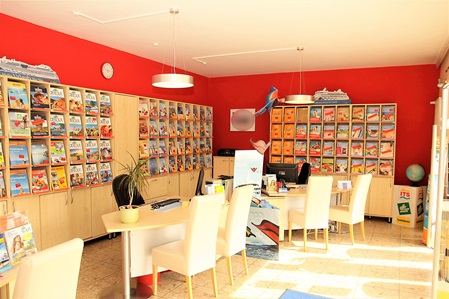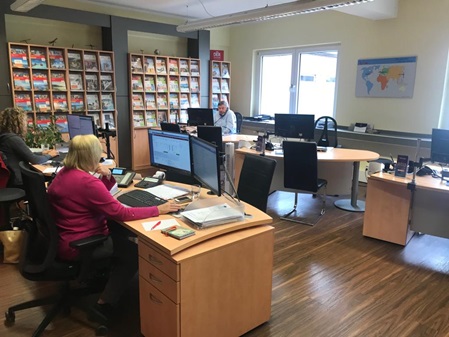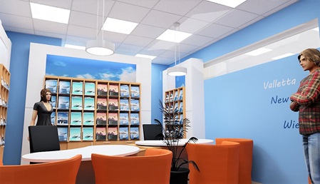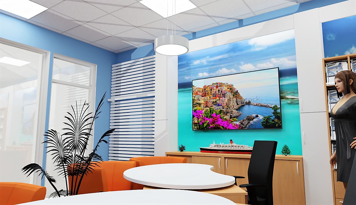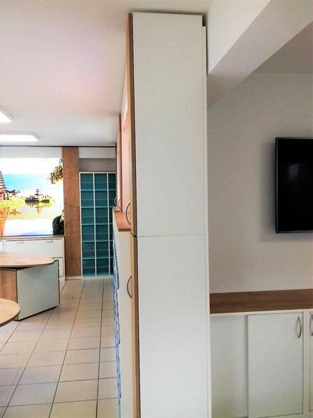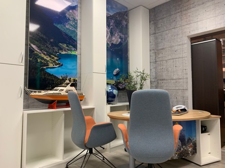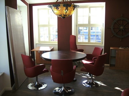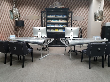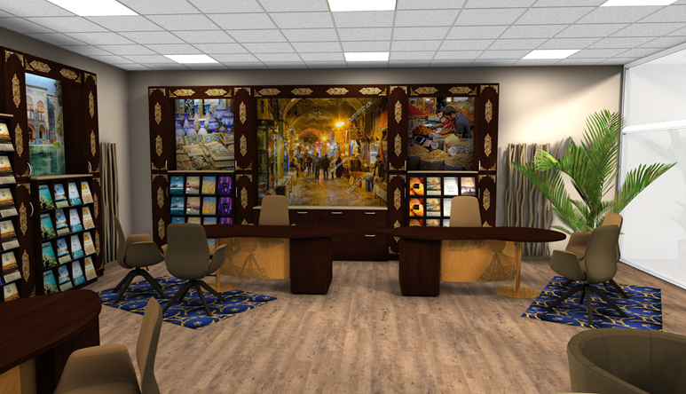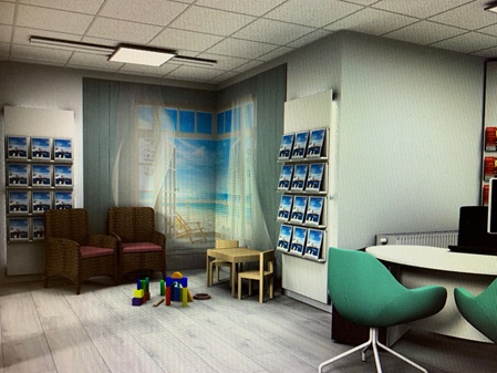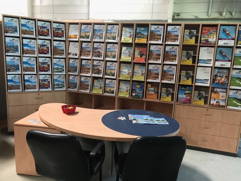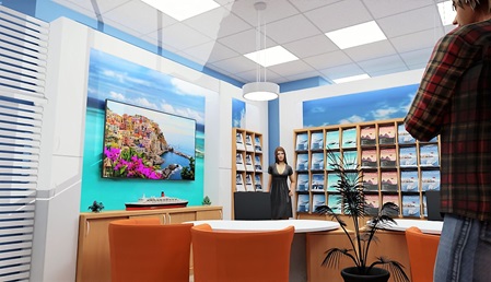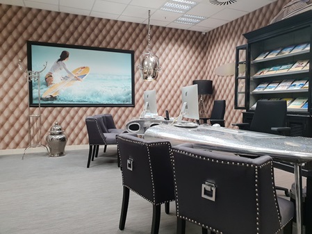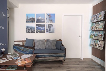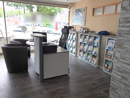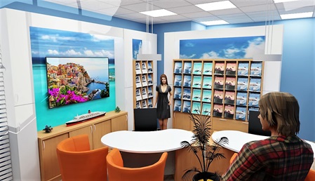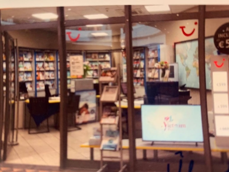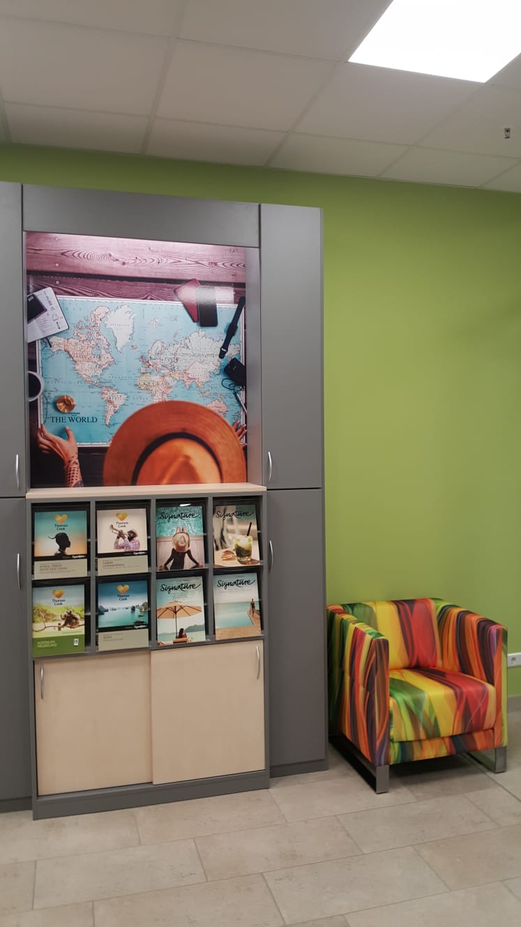 Zeitlos schöne Reisebüro Einrichtung mit drei Arbeitsplätzen.