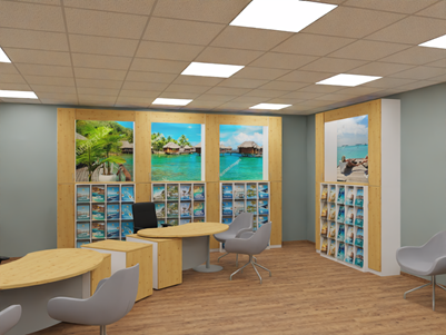 Prospektschränke mit Sommer- Wintereinteilung. Sideboards, 2x Reisebürocounter wie abgebildet oder ähnlich. Bestuhlung aus Secondhand Bestand oder neu. Verhandlungssache.