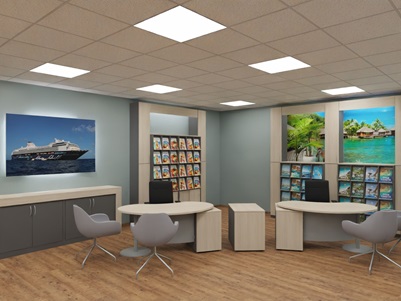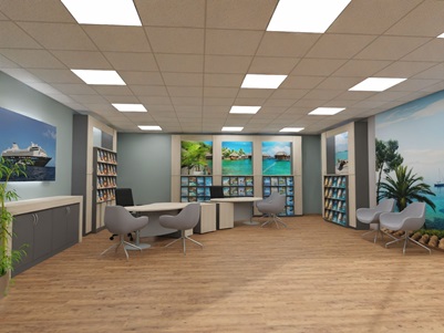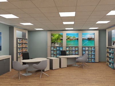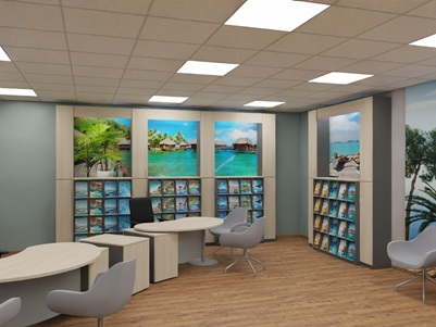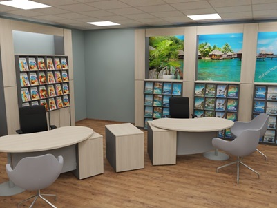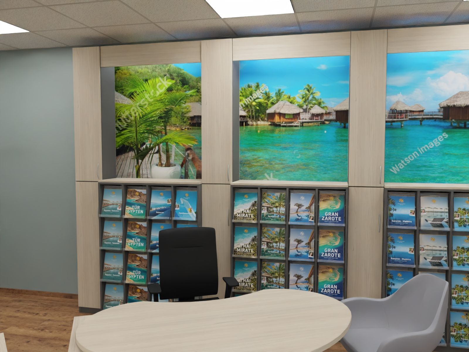 Prospektschränke mit Sommer- Wintereinteilung. Sideboards, 2x Reisebürocounter wie abgebildet oder ähnlich. Bestuhlung aus Secondhand Bestand oder neu. Verhandlungssache.