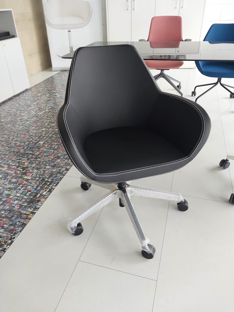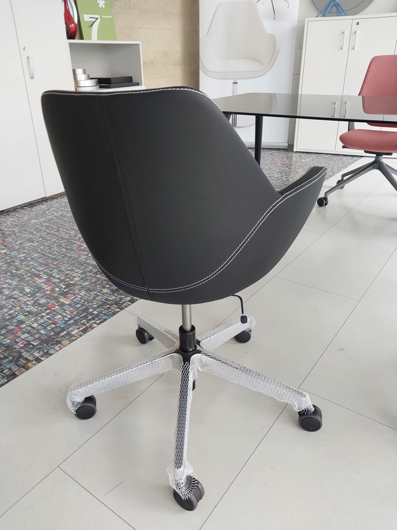 Fan auf Rollen oder Metallfuß. Schwarz, weiße Nähte.