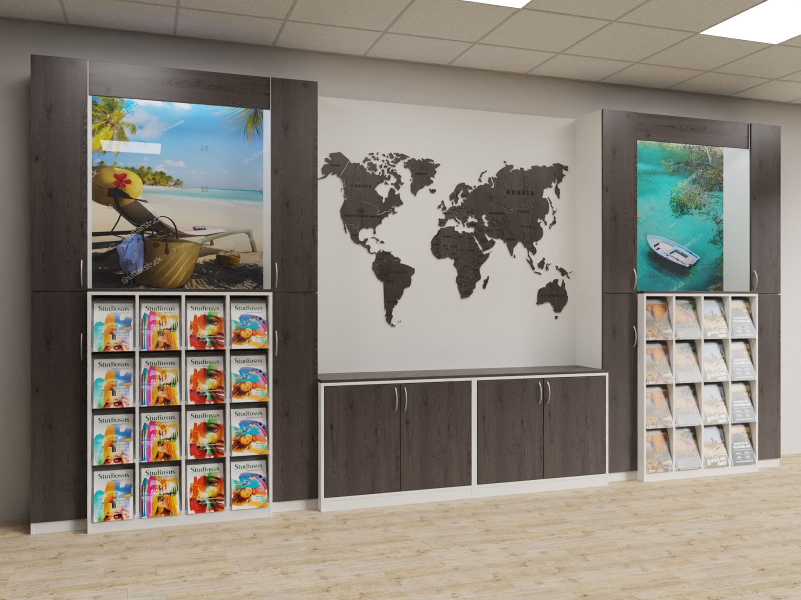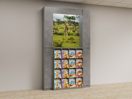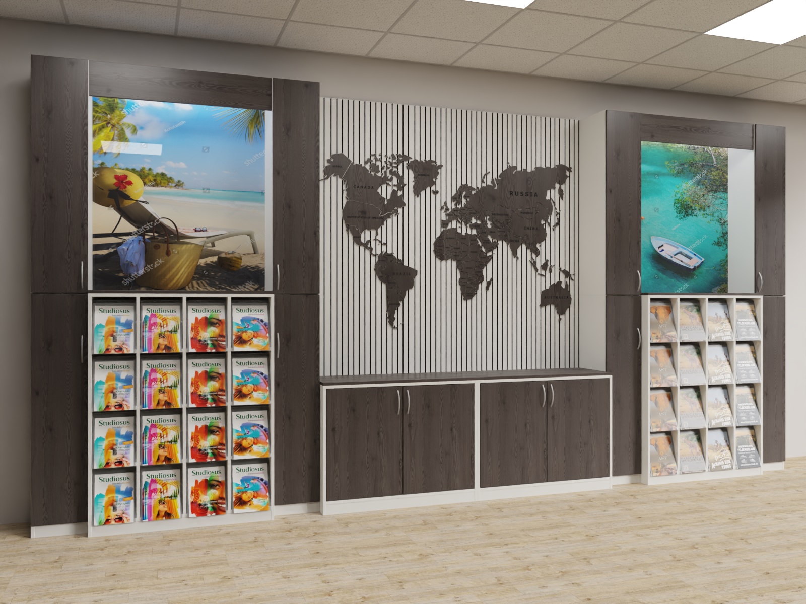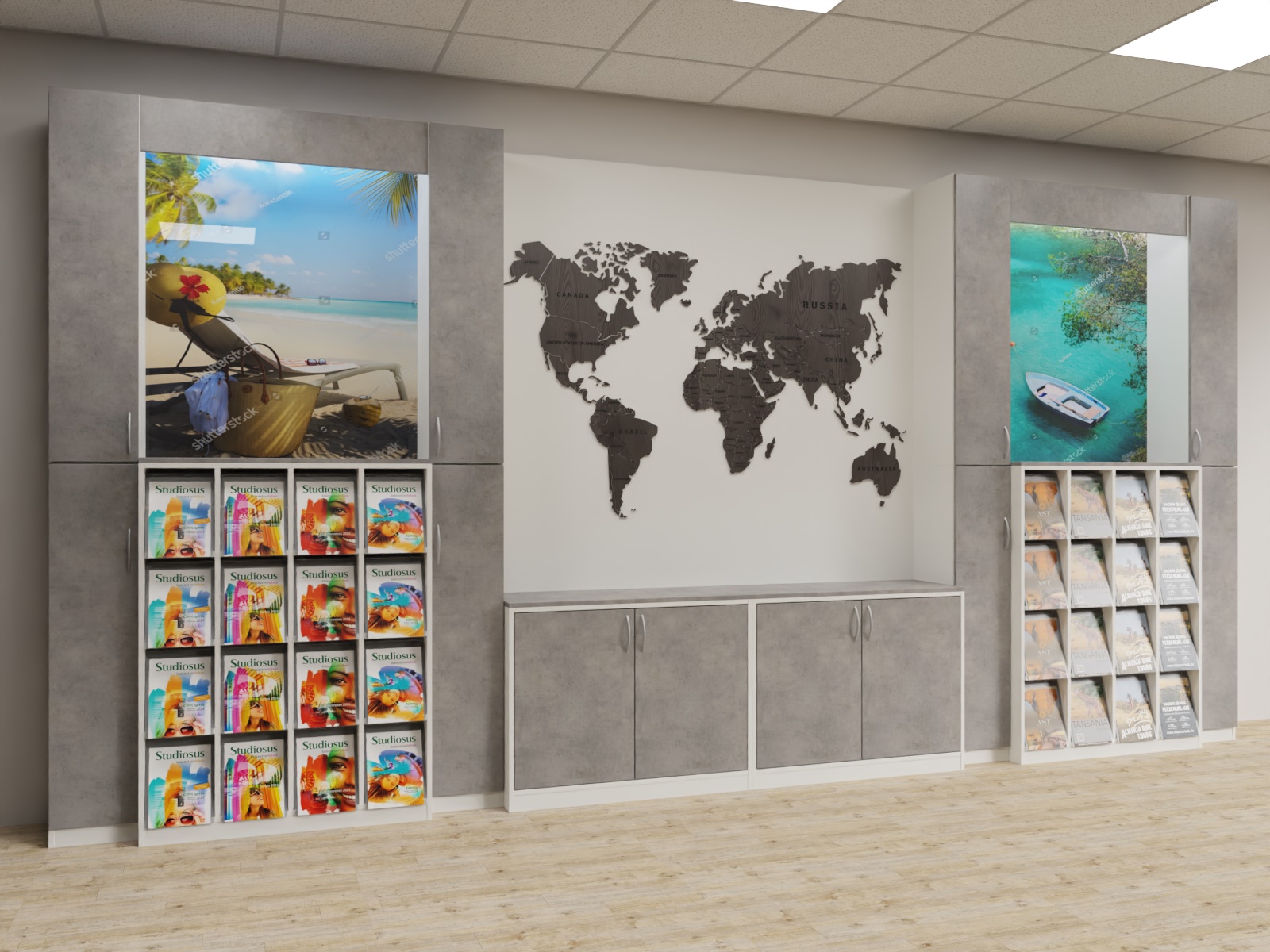 Kombination mit 3d Weltkarte aus Holz auf AkustikpaneeleKorpus: W980 Weiß Front: F186 Beton -