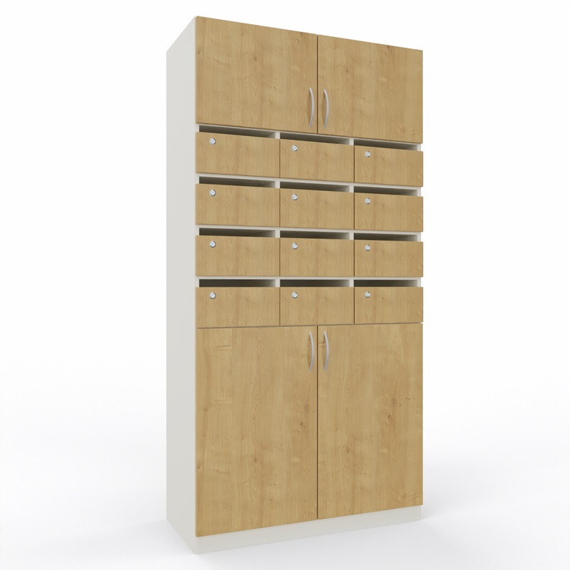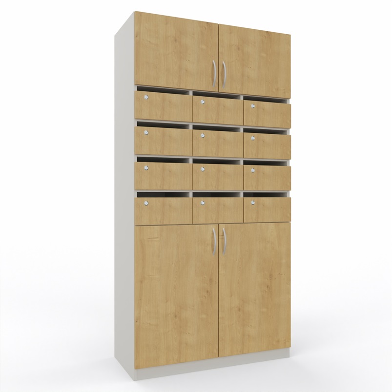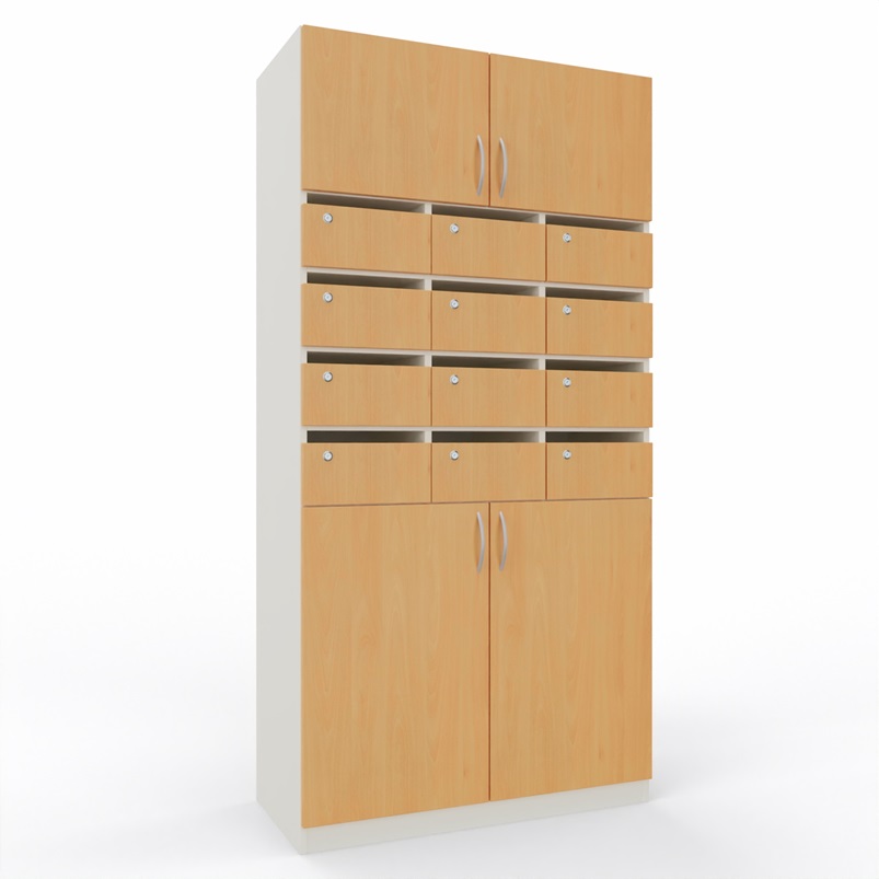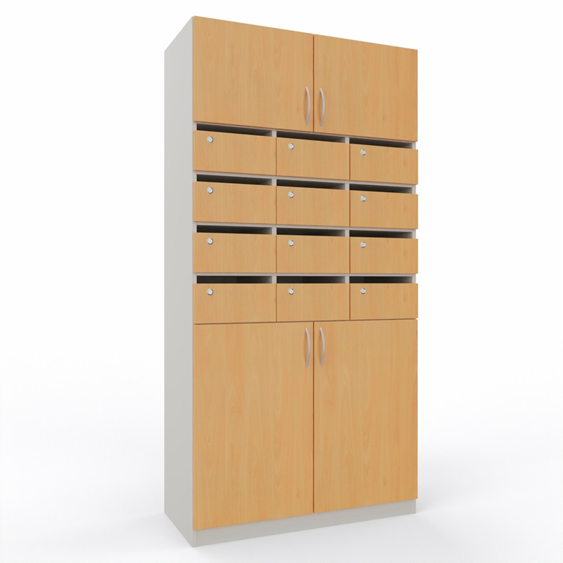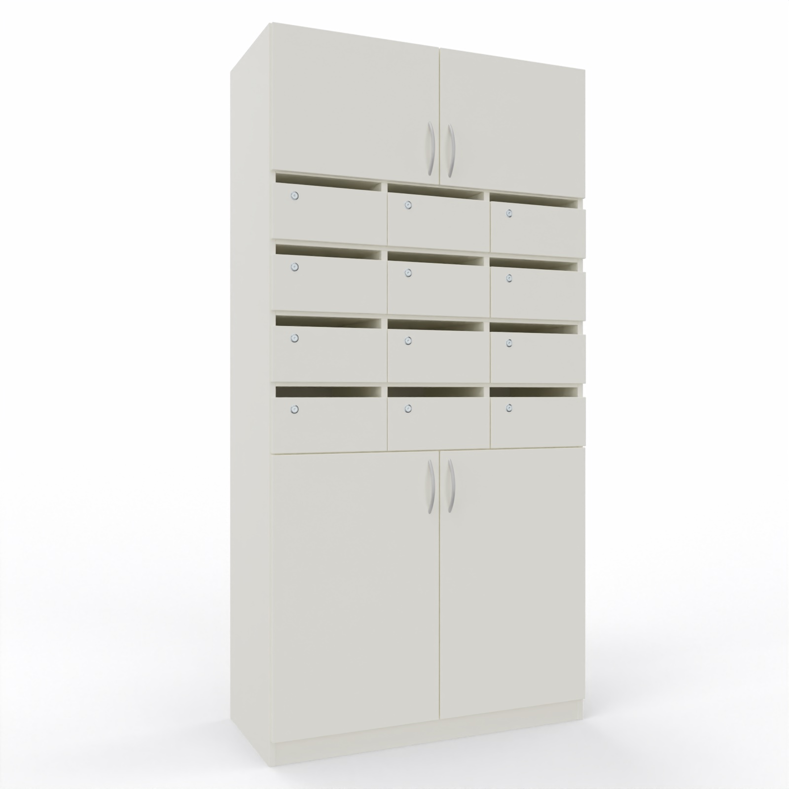 Postfachschrank mit 12 Postfächern und Türen oben und unten.