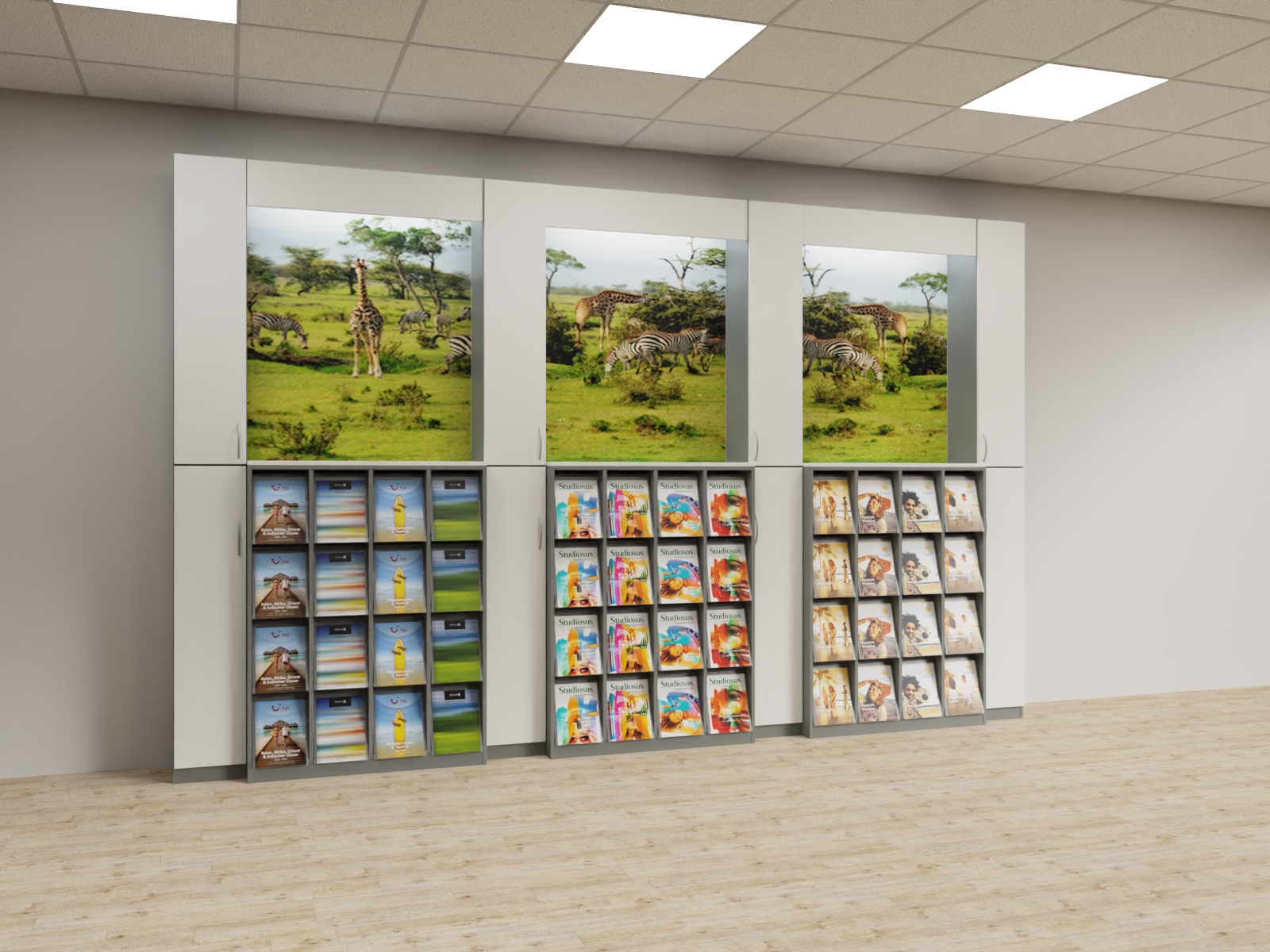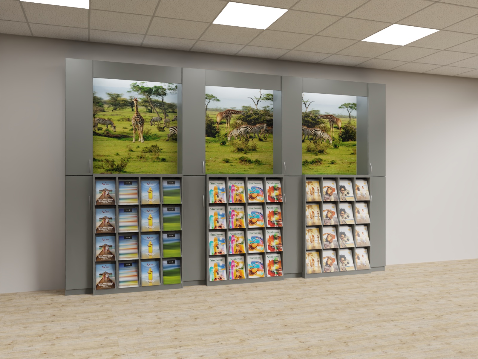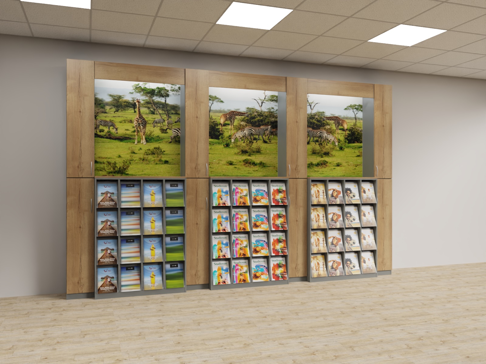 Variante 02 4x Funktionsäule, 3x K4x4 Prospektschrank, Bildrückwände, Lichtwinkel