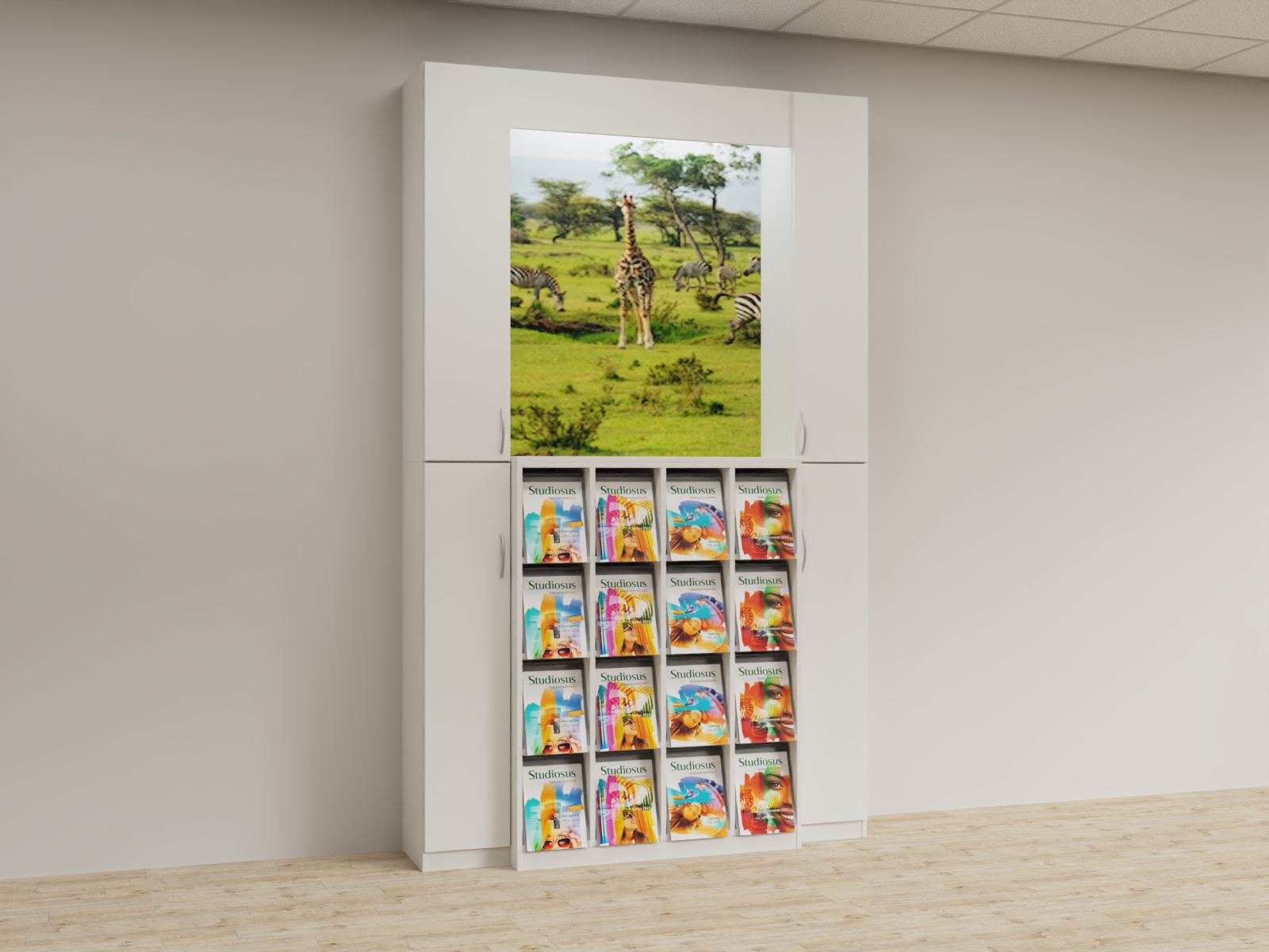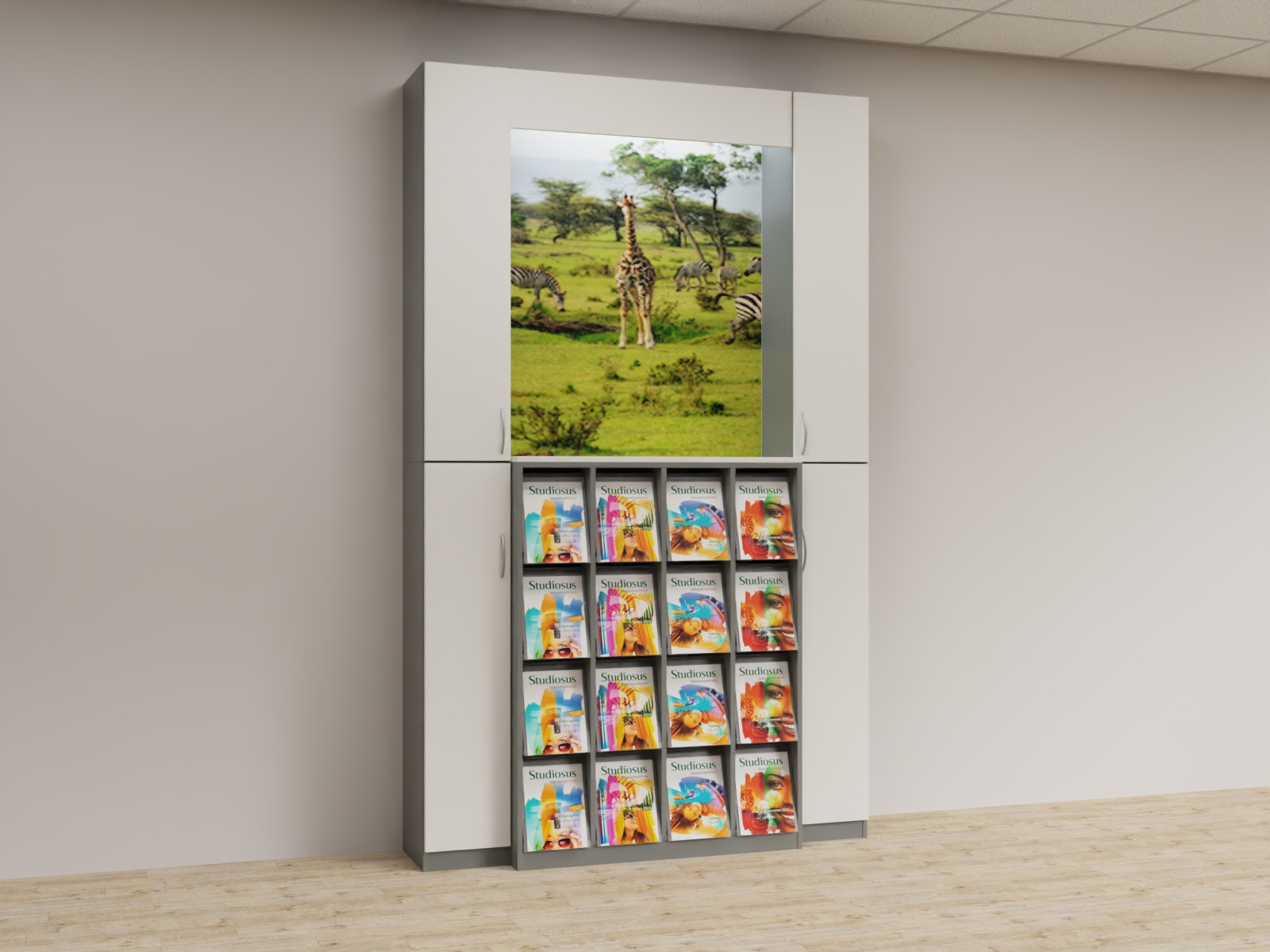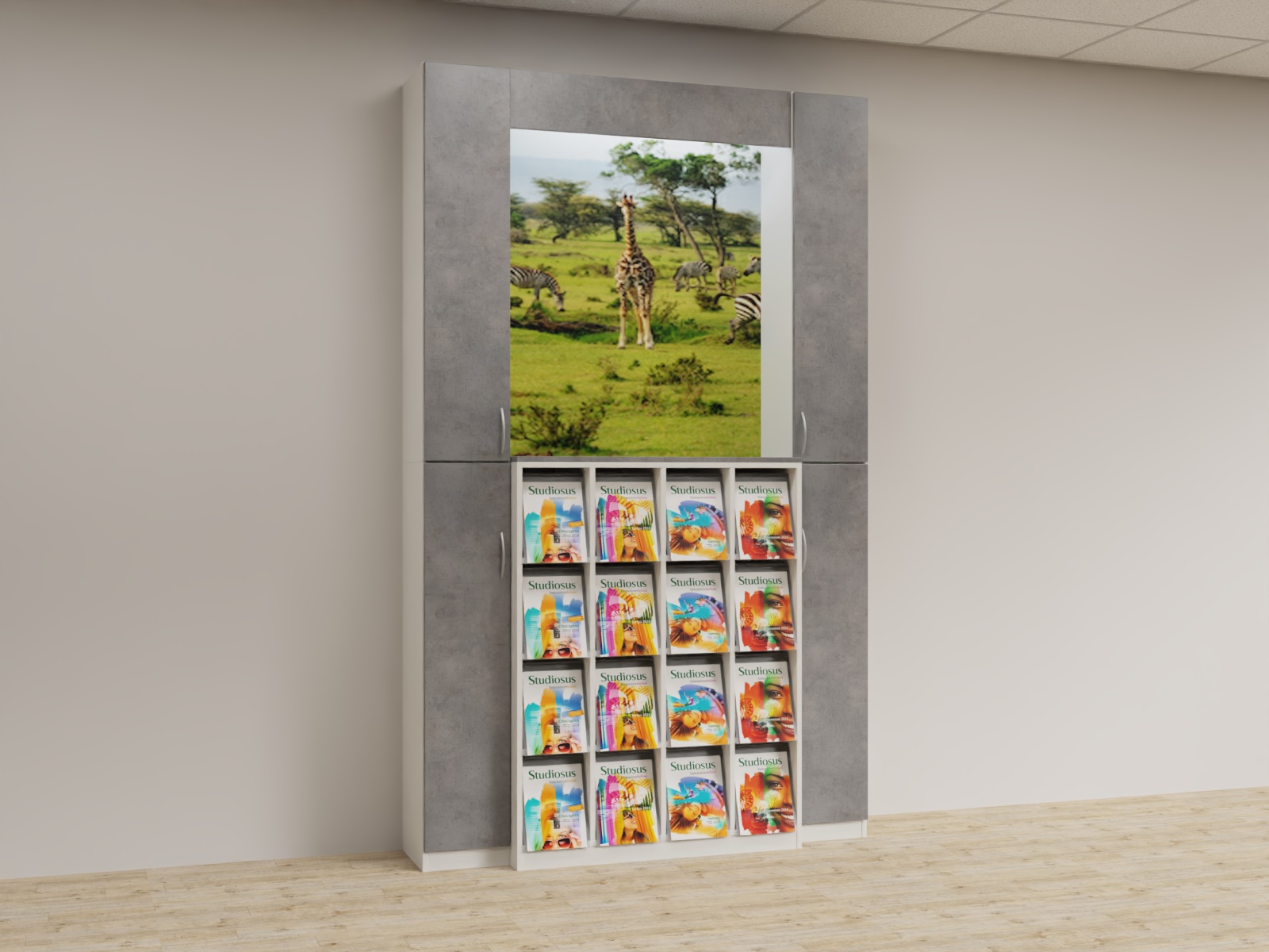 Variante 03 2x Funktionsäule,1x K4x4 Prospektschrank, Bildrückwände, Lichtwinkel